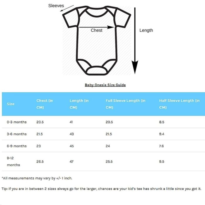 Sizes available for kids t-shirts as per age group from 1 -16 Years | Sizes available for Kids Onesies/Baby rompers (as per age group) 0-3, 3-6, 6-9, 9-12 months baby in full/half sleeves. Please go through the size chart before confirming the sizes. Replacement: In case of any size issue, kindly send us a message in amazon via buyer-seller messages.