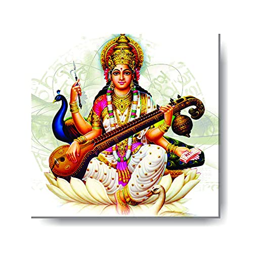 Yaya Cafe 10×10 inches Goddess Saraswati with Peacock Idol Modern Art Wall Hanging Poster Paintings Canvas Photoframe