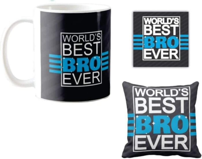 Yaya Cafe Birthday Gifts Combo for Brother, Worlds Best Bro Ever Mug, Coaster, Cushion Cover, Set of 3