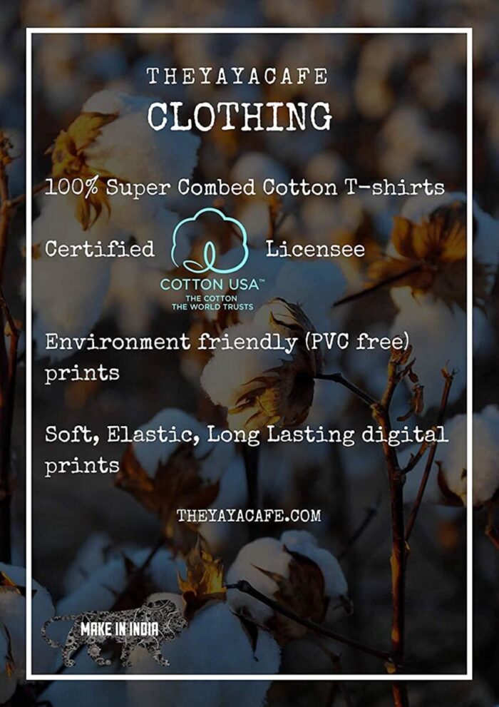• Fabric: Cotton, Fabric Strength: 160 – 180 GSM, Style: Printed, Neckline: Round Neck, Sleeve Length: Half Sleeves, Color fastness of fabric and print – 100%
