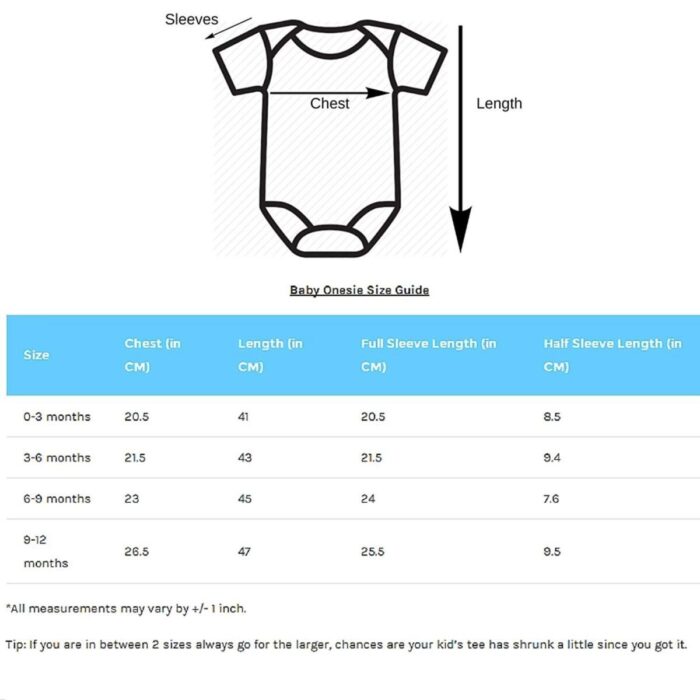Sizes available for Kids Onesies/Baby rompers (as per age group) – 0-3, 3-6, 6-9, 9-12 months baby in full/half sleeves.