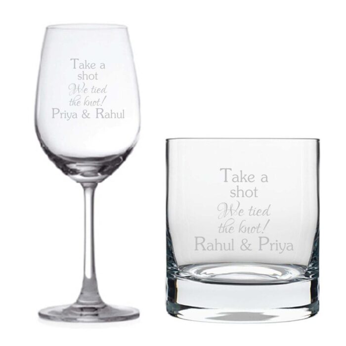 Wish the newlywed or the couple celebrating their anniversary with our Personalized Take A Shot We Tied The Knot Wine Glass & Whiskey Glass With Coaster. A gift forever! Available in a Set of 2 with coasters this personalized White Glasses, designed to accentuate the characteristics of white vintages; they are Gracefully shaped but sturdy, and are an ideal gift for anyone with a well-stocked home bar.