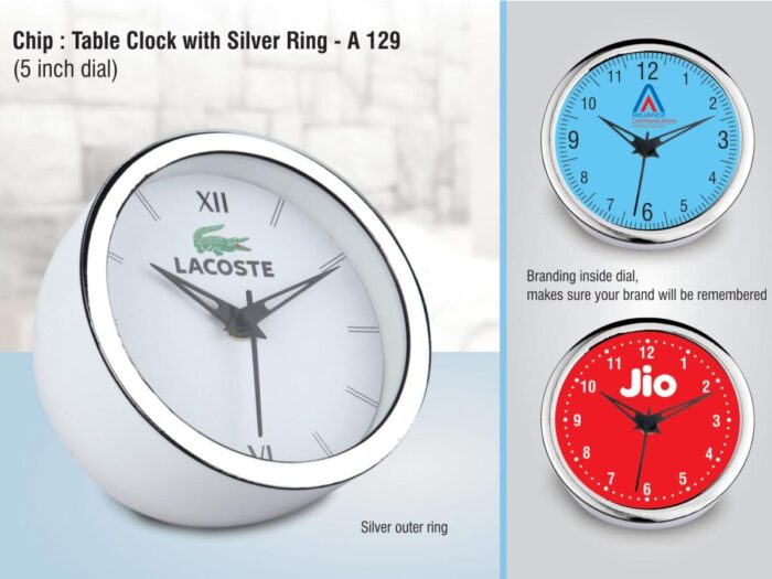 – Round table clock with silver color border – Silver ring enhances the look of the clock – Optimal size suitable for any size table – Branding inside dial, makes sure your brand will be remembered – Easy to change batteries, just pull out clock from sides