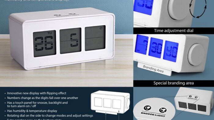– Innovative new display with flipping effect – Numbers change as the digits fall over one another – Has a touch panel for snooze, backlight and to turn alarm on / off – Rotating dial on the side to change modes and adjust settings – Has humidity and temperature display – Extra printing area on…