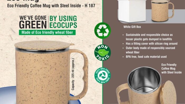 – Premium quality coffee mug – Sustainable and responsible choice – Outer body made of responsibly sourced Wheat fiber – Stainless steel inside – Dual wall so it’s easier to hold with hot liquids inside – Has a fitting cap with silicon ring around – This ecocup is made from food safe materials