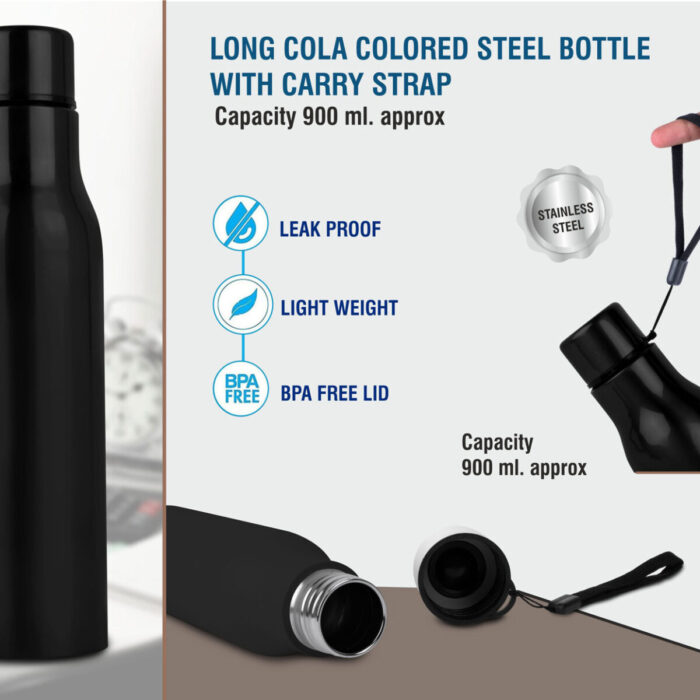 – Single wall Stainless steel bottle – Attractive shape – Leak proof cap construction – Cap plastic is food safe and BPA free – Comes packed in White gift box – Capacity: 900ml approx – Color: Black
