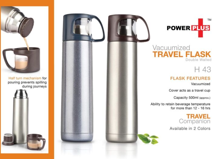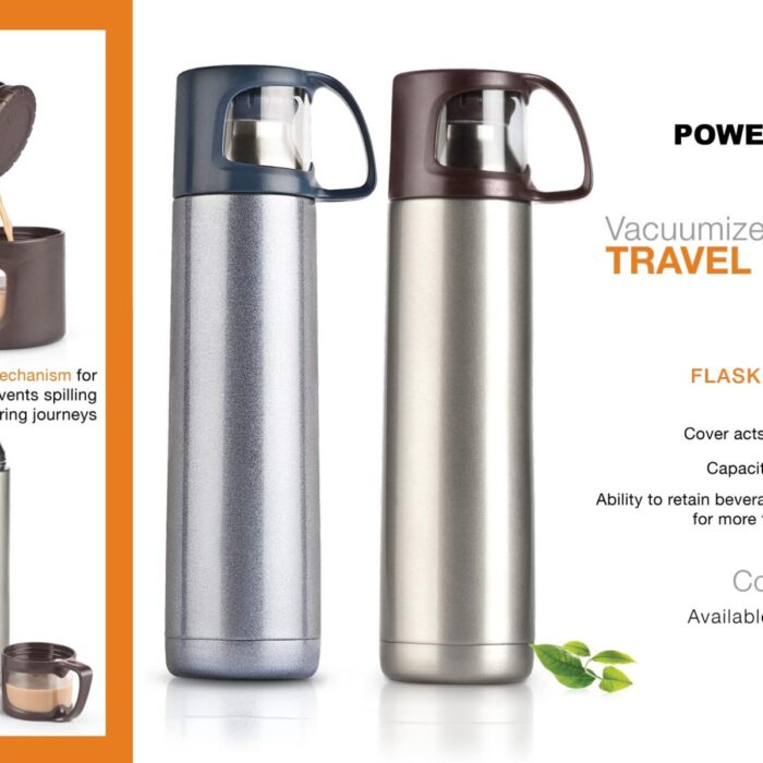 – Flask has the ability to retain beverage temperature for around 24 hours – Cover acts as a travel cup – Vacuumized, Double walled and insulated – Half turn mechanism for pouring prevents spilling during journeys – Capacity 500 ml (approx)