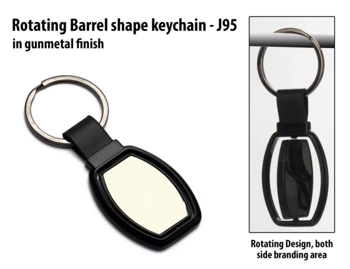 – Metal keychain in barrel shape – Rotating keychain with branding area on both sides – Gunmetal finish for elegant look after engraving