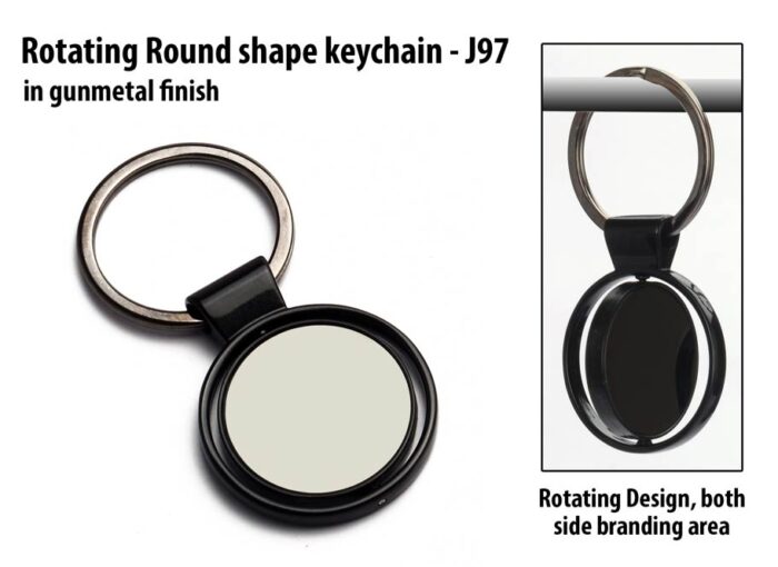 – Metal keychain in round shape – Rotating keychain with branding area on both sides – Gunmetal finish for elegant look after engraving