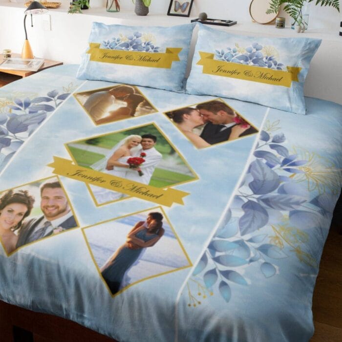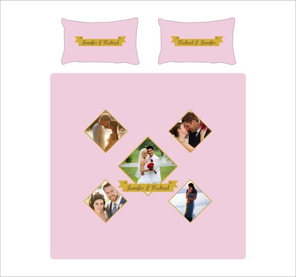 A beautiful Personalized Photo Bed Sheet for Couple with their photos and names printed on it. This customized romantic bedsheet is available in a choice of colors and can be completely customized.